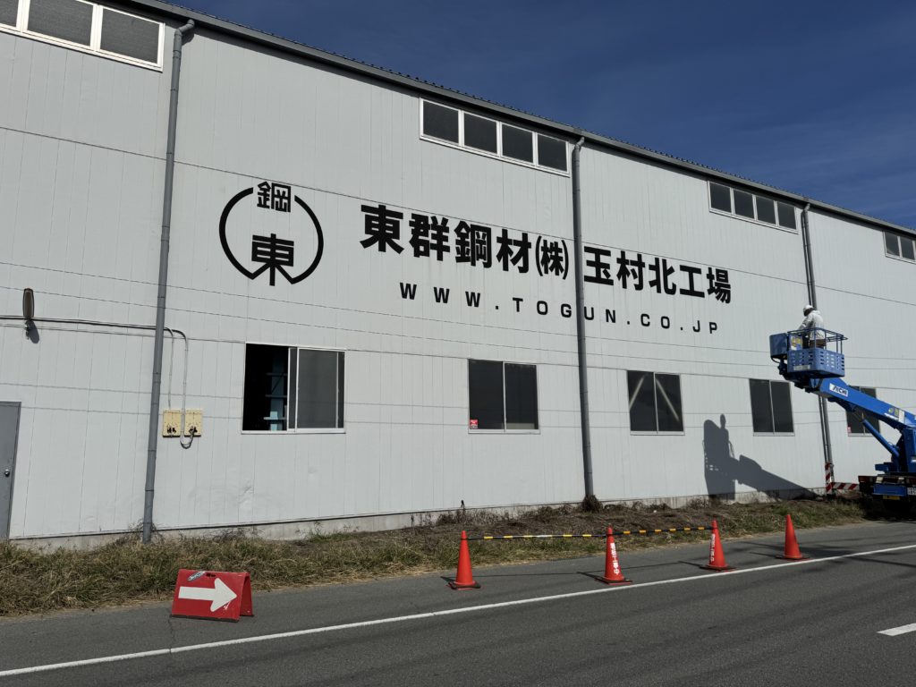 工場壁面は面積が広く高さもあるため、文字サイズ・配置バランス・安全な施工を心掛けました。